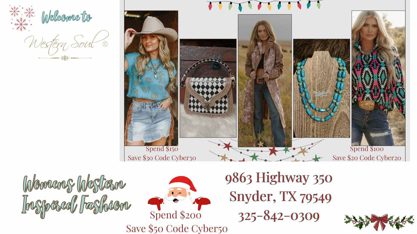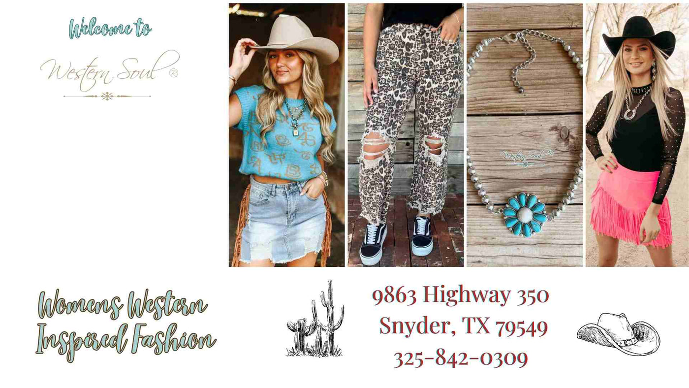 Western Soul® also offers you the latest styles of denim jeans for women by L&B Apparel, shoes from American Darling, classy women's styles from 2 Fly Co western graphic t-shirts by Rowdy Crowd Clothing, and so much more! Check out our selection of trendy, affordable western jewelry for women too. Western Soul® is the trusted western fashion boutique choice when looking for your favorite cowgirl jewelry, clothing, and accessories. Based in Snyder, Texas, our western boutique is committed to exceptional customer service and full satisfaction. We ship orders same/next day, so shop our extensiv