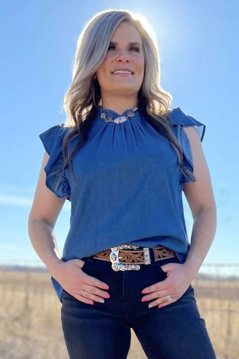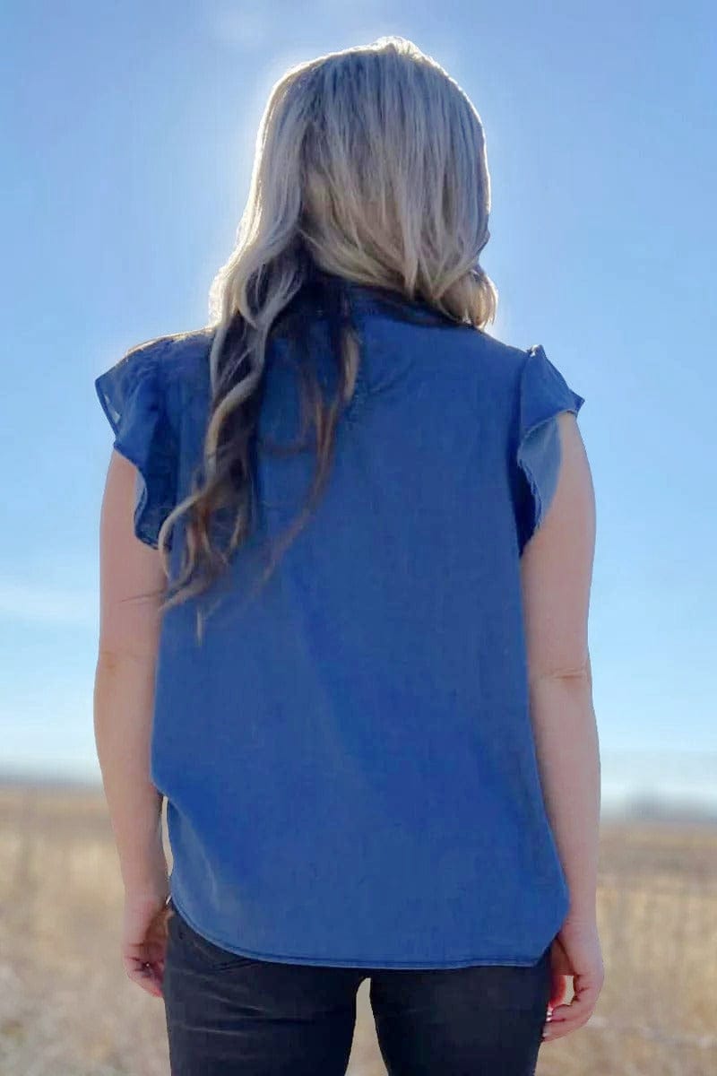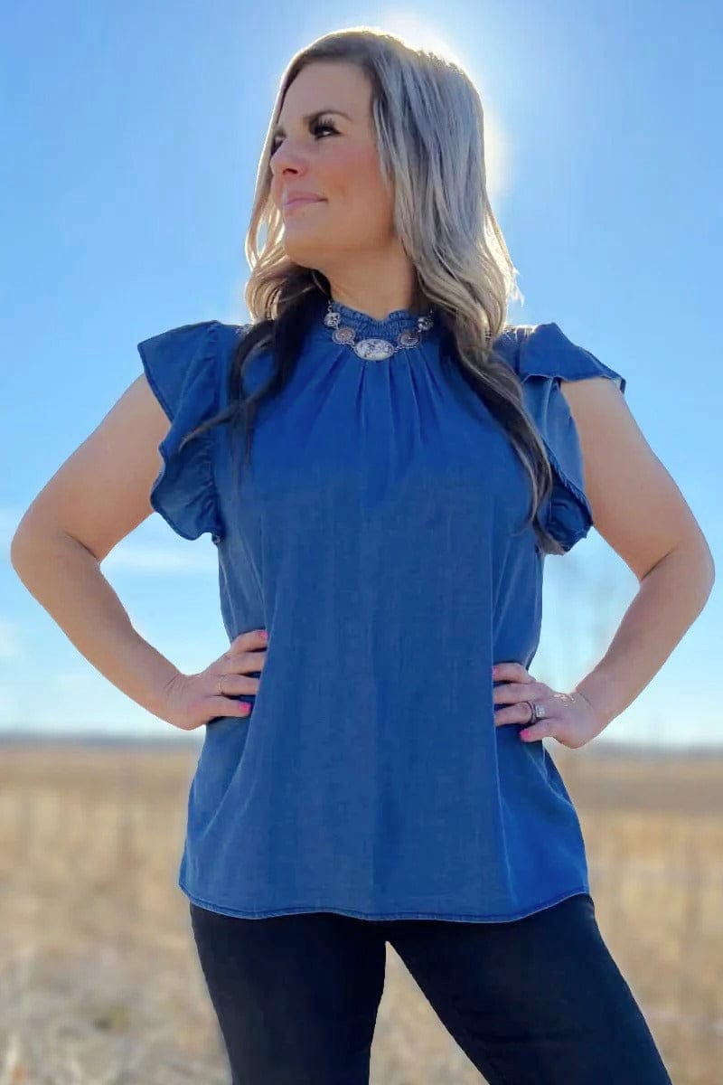 Get ready to rock your style with this Babydoll Top Denim Dark Wash! Made from dark wash denim, this top features a short ruffle sleeve for a trendy touch. Perfect for any occasion, this top will make you look effortlessly chic and stylish.