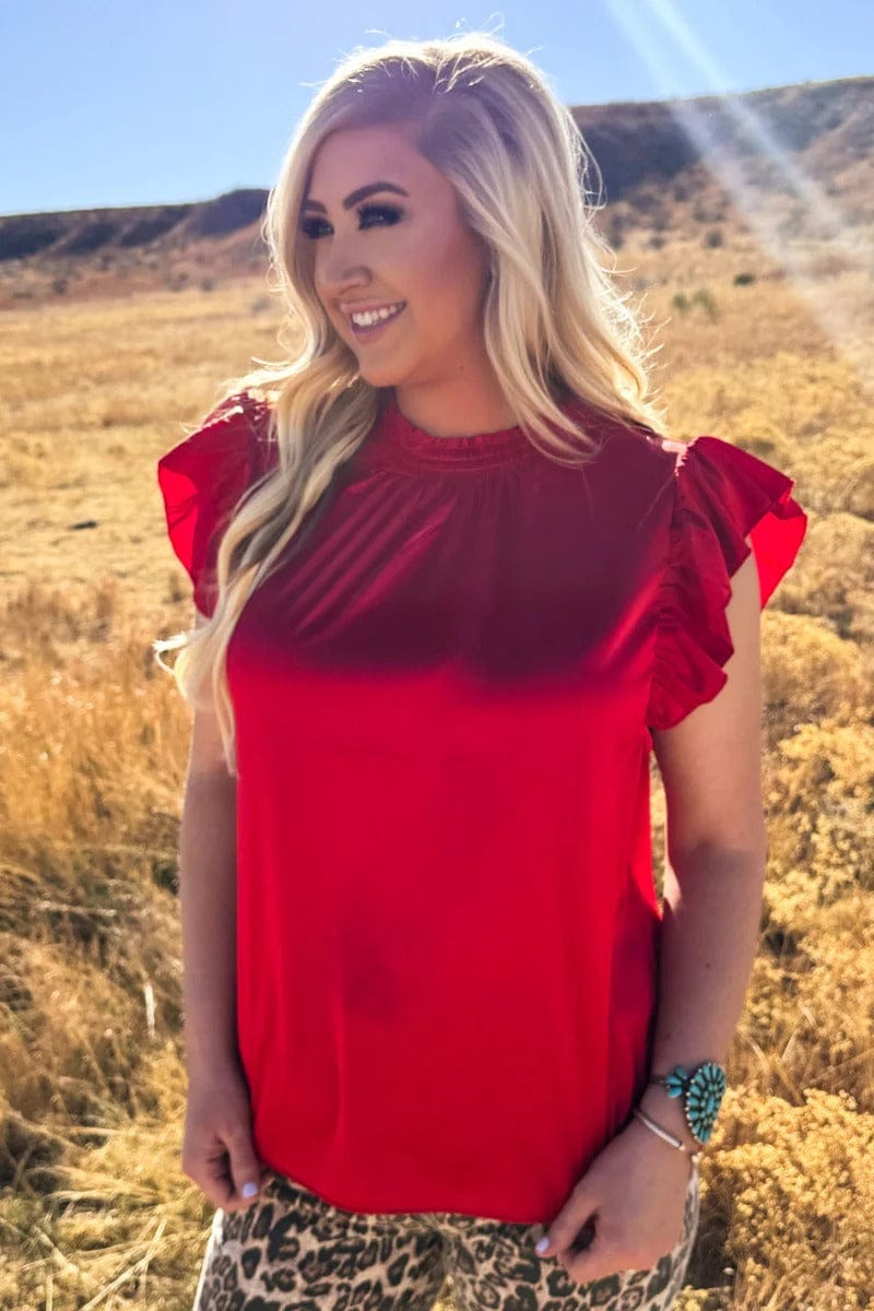 Elevate your wardrobe with this stunning red babydoll top, featuring delicate ruffle sleeves that add a playful touch to any outfit. Crafted from silky fabric, it drapes beautifully against your skin for a soft, luxurious feel. The relaxed fit and short length make it perfect for pairing with high-waisted bottoms or layering over your favorite pieces. Whether you're dressing up for a night out or keeping it casual, this versatile top brings effortless style and feminine charm to your everyday look.