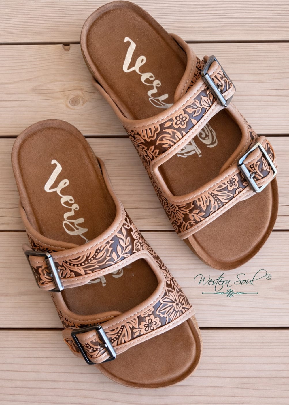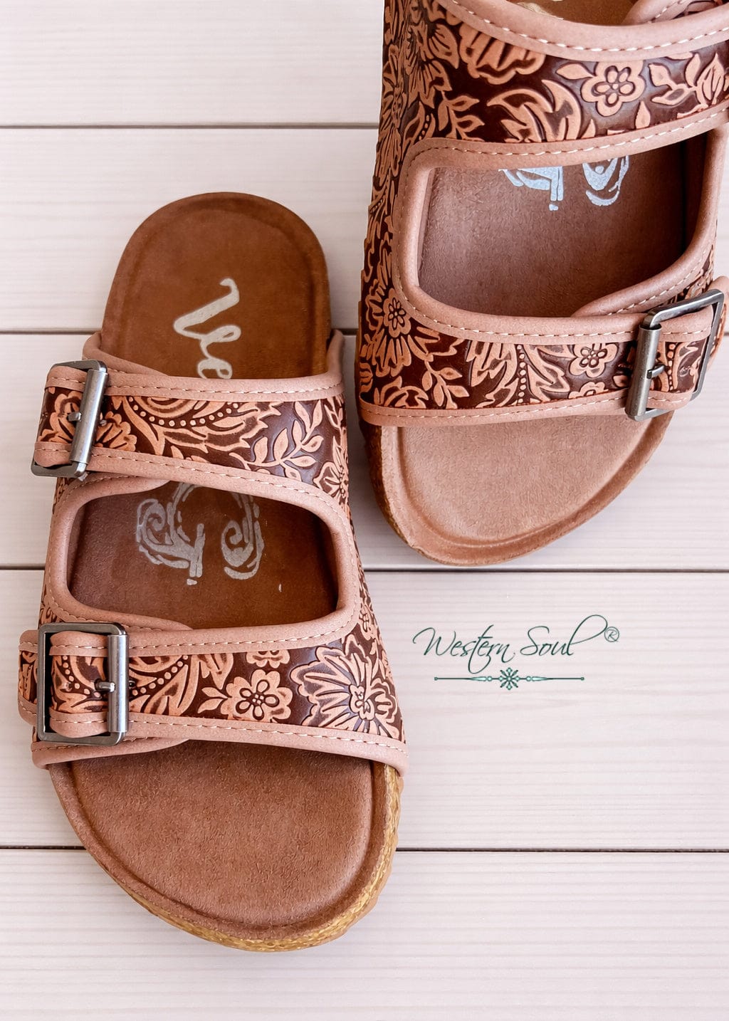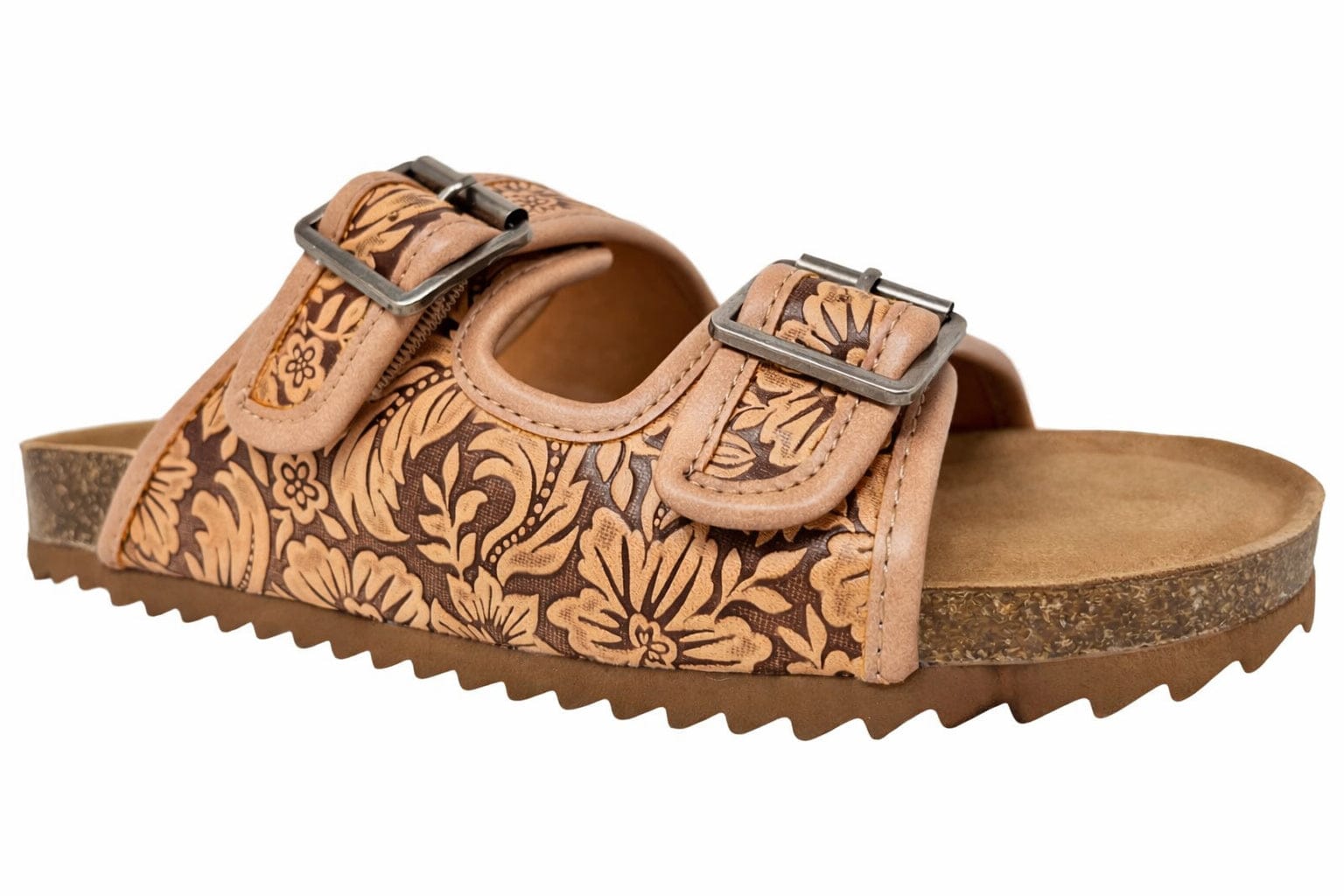 Step into effortless western charm with the Berry 5 Very G Sandals. Designed with a beautifully detailed floral embossed pattern, these sandals bring just the right touch of rustic elegance to your everyday look. Featuring dual adjustable buckle straps for a custom fit, this slip-on style combines comfort and standout style in one.