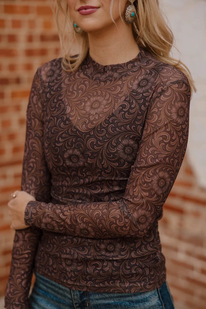 Elevate your style with the Bronzed Bloom Mesh Top, featuring an intricate tooled leather pattern adorned with beautifully crafted tooled flowers. The delicate mesh fabric offers a subtle contrast that highlights the artistic leatherwork, making this top a unique statement piece perfect for special occasions or standout everyday wear. Experience a blend of elegance and edgy craftsmanship in one stunning design.