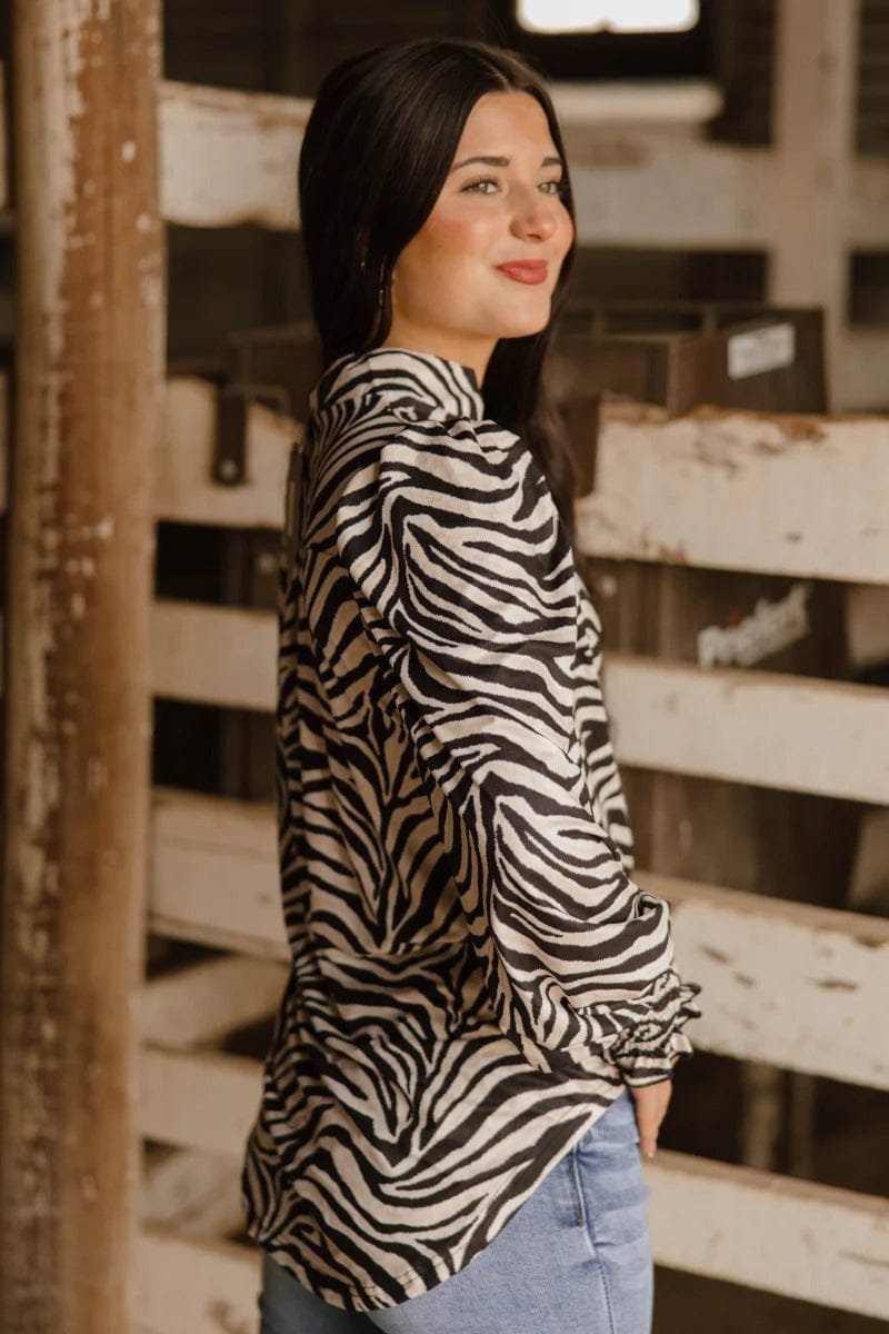 Make a bold statement with the Canyon Call Top in striking zebra print. This long sleeve essential features a playful animal pattern that pairs effortlessly with your favorite denim or neutrals. The fitted cuff sleeves add a polished touch, keeping things put-together while you go about your day. Perfect for layering or wearing solo, this versatile piece brings instant personality to any outfit. Whether you're heading to brunch or the office, the Canyon Call Top delivers style with an adventurous edge.