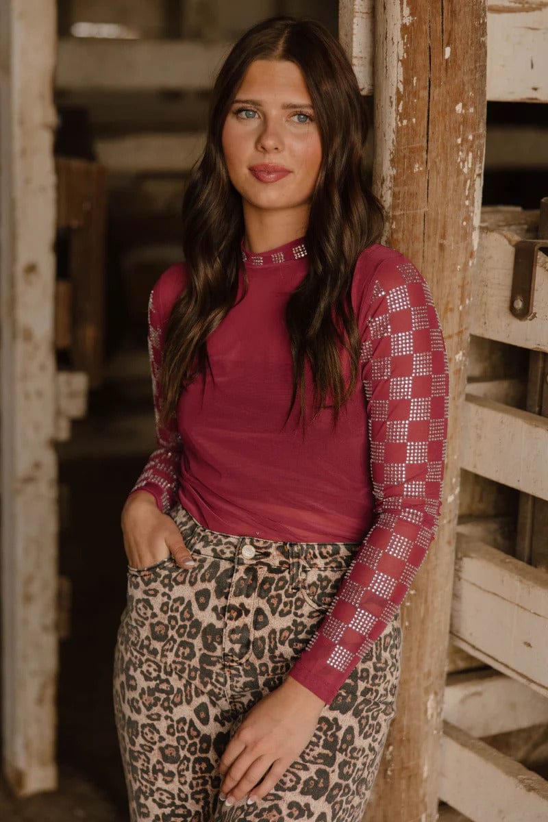 Make a bold statement with the Checked In Maroon Mesh Top, featuring a rich maroon mesh fabric embellished with sparkling rhinestones arranged in a stylish checked pattern on the sleeves and neckline. This top combines elegance and edge, perfect for adding a touch of glamour to your wardrobe while keeping you comfortable and confident.
