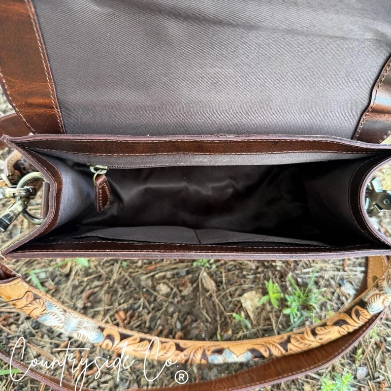 The Cimarron Bloom Handbag blends timeless Western artistry with everyday sophistication. Designed with beautifully tooled leather throughout, this handbag showcases intricate floral detailing and hand-painted accents that make each piece truly one of a kind. The dual adjustable shoulder straps—crafted from matching tooled leather—offer both comfort and versatility, while the antique-style clasp adds a touch of vintage charm and secure closure.