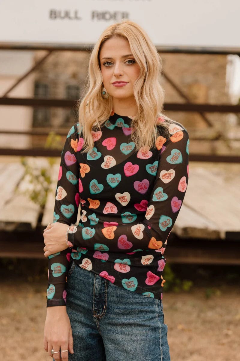 Get ready to charm your way into everyone's heart with our Cowboy Sweetheart Mesh Top! This cute top features a sweet Valentine's candy design, making it the perfect choice for Valentine's Day. Adorn yourself with love and style, and spread the love this season.