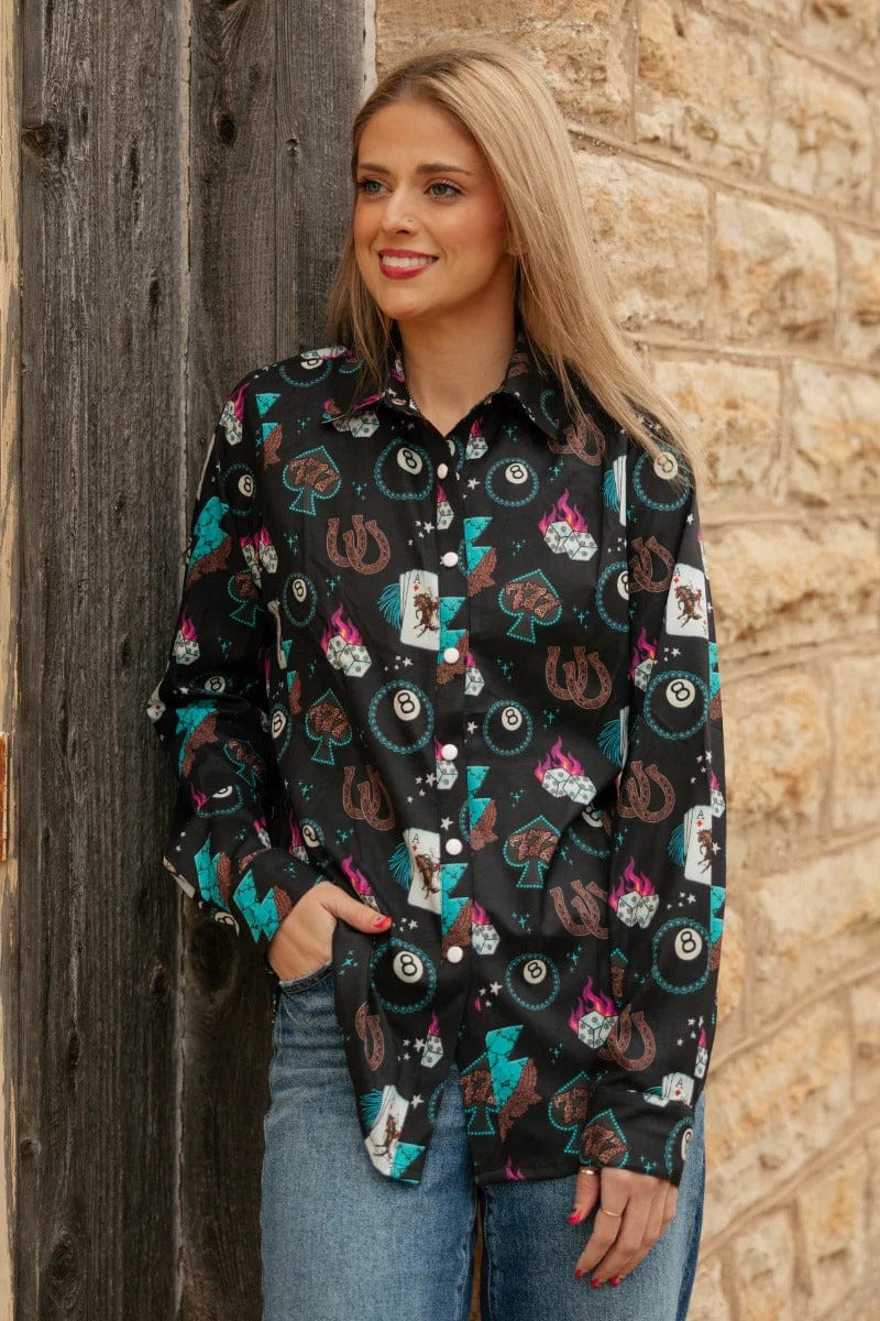 Saddle up in style with this eye-catching button-up shirt featuring an electrifying western pattern that blends classic Americana with bold, playful details. Lightning bolts, playing cards, spades, dice, eight balls, and horseshoes dance across premium fabric, creating a conversation-starting look that captures the spirit of the Old West with a modern twist. Perfect for rodeos, country nights out, or anyone who loves statement pieces with personality. This versatile shirt pairs effortlessly with jeans, skirts, or layered styling for an unforgettable cowgirl aesthetic that turns heads wherever you roam.