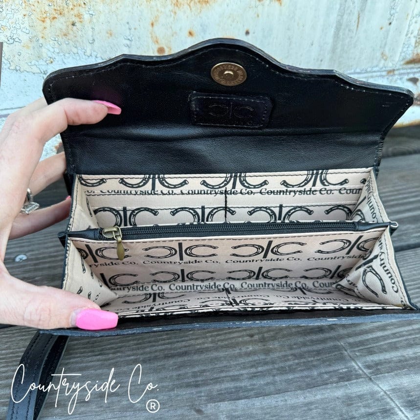 Inside, you’ll find 8 credit card slots, a zippered coin compartment, and two side pockets for cash, receipts, or small essentials. The detachable wristlet strap makes it easy to grab and go — perfect for busy days, rodeo nights, or travel.
