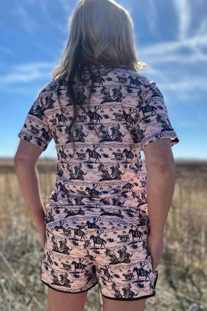 Comfortable and stylish blush-colored athletic shorts for the modern rancher. These shorts feature an all-over pattern showcasing daily ranch activities—from herding cattle to mending fences—bringing your work to life in wearable art. Perfect for active days whether you're working the land or heading to town. The regular length offers classic coverage with breathable fabric that moves with you.