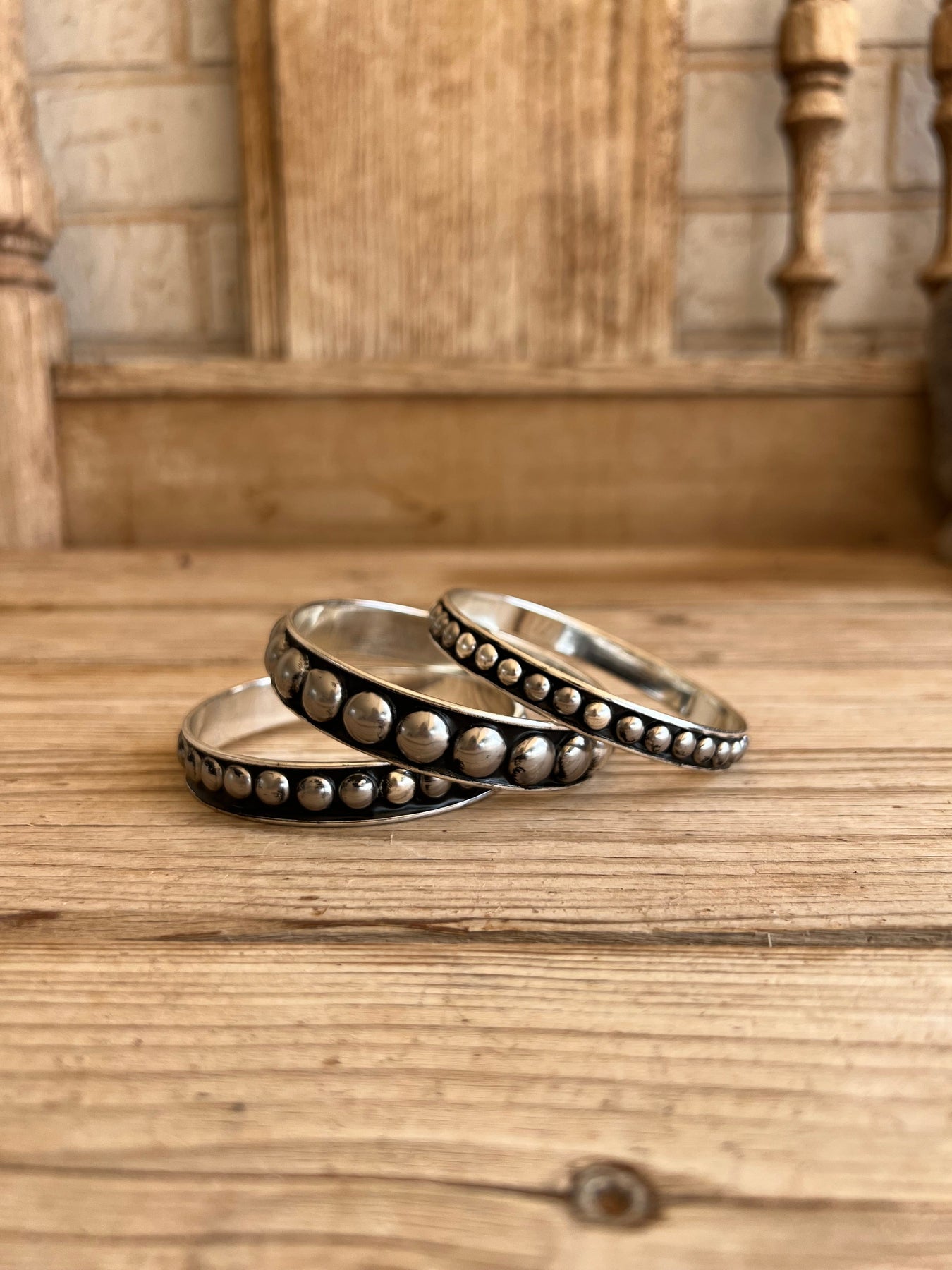 Saddle up in style with this bold western-inspired set! The Dusty Trail Bracelet is actually three separate bangles, each crafted with rows of raised silver toned bubbles that shimmer like desert stars against a darkened backdrop. Stacked together, they create a powerful statement piece—strong, rugged, and endlessly versatile.