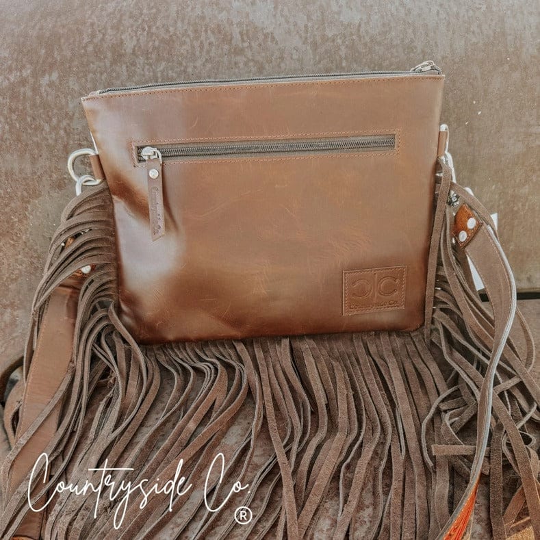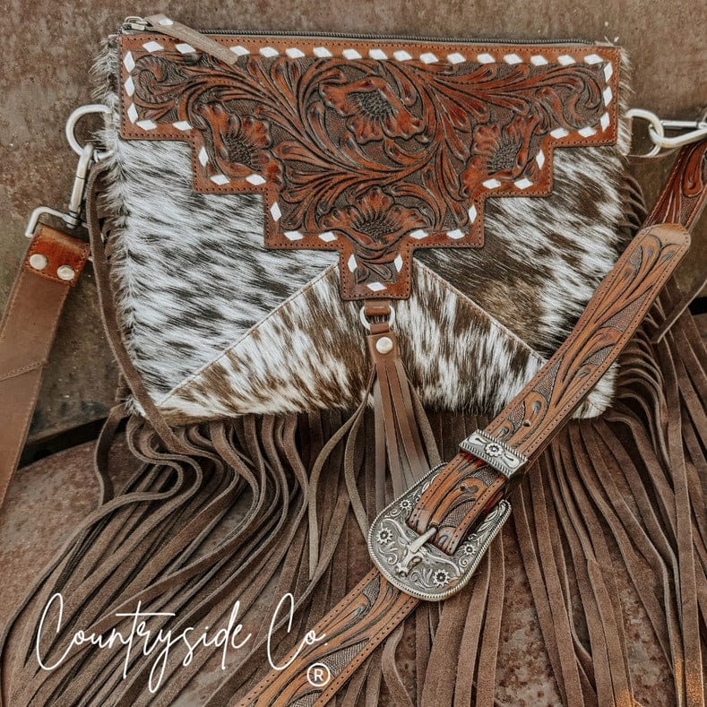 The Fort Worth Cowhide Crossbody blends rugged character with timeless Western style. The front showcases rich, one-of-a-kind cowhide paired with intricately tooled leather, while the smooth leather back keeps things sleek and functional. Finished with flowing fringe, this bag delivers movement, texture, and unmistakable Western charm.