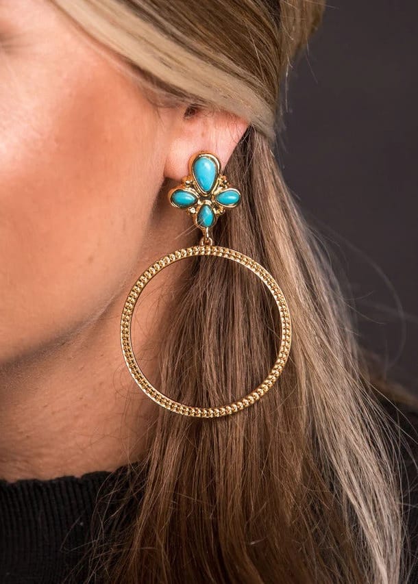 Illuminate your look with the Golden Sky Hoops — a stunning blend of Western charm and timeless elegance. These statement earrings feature vibrant turquoise stones set in a delicate gold floral design, leading to a textured gold toned hoop that catches the light beautifully with every move.