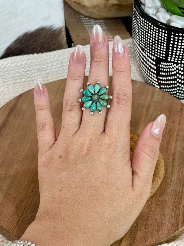 A stunning statement piece featuring genuine Kingman turquoise set in sterling silver. This handmade ring offers beautiful cluster detail and is adjustable for a perfect fit on any finger.