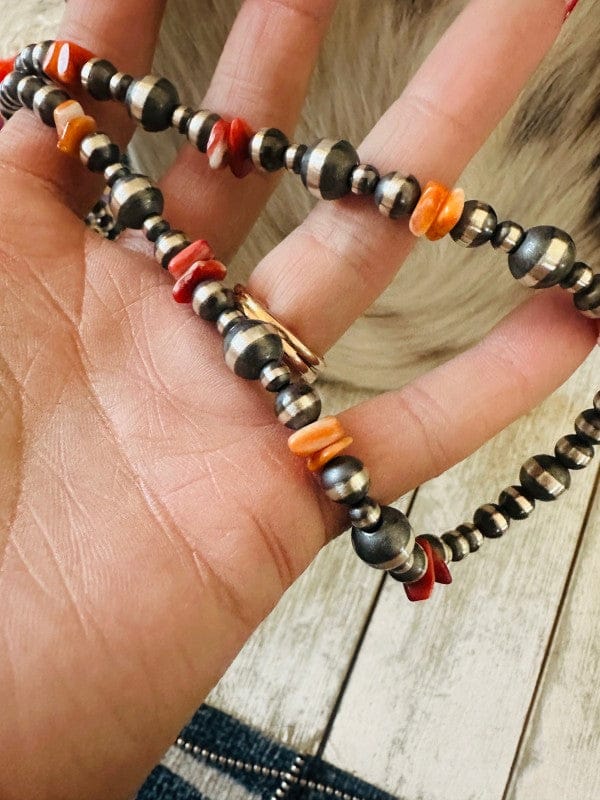 Beautiful Handcrafted Handmade Sterling Silver Navajo Pearl and Spiny Oyster Shell Beaded Necklace. Measures 18 inches long. Such a pretty necklace!