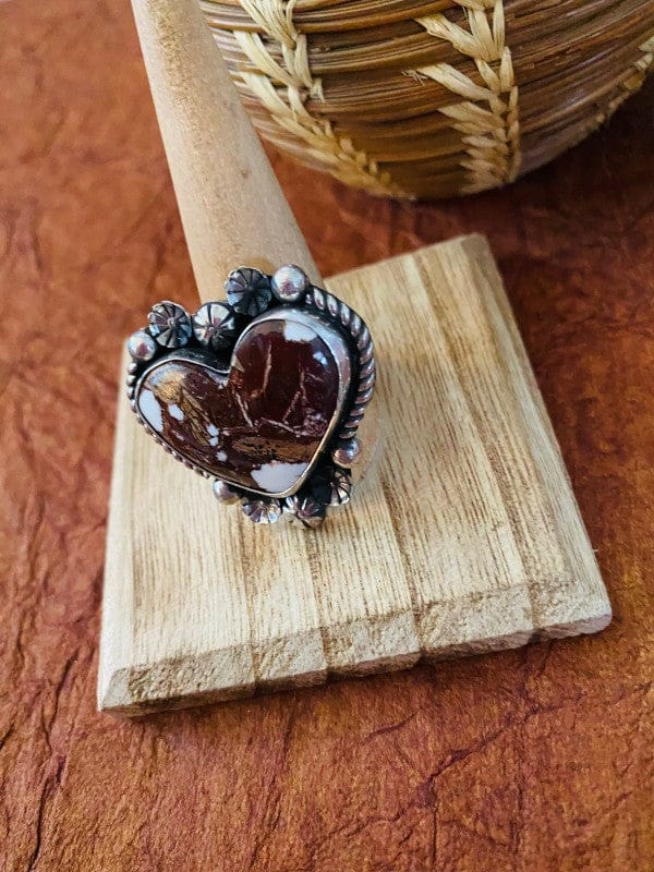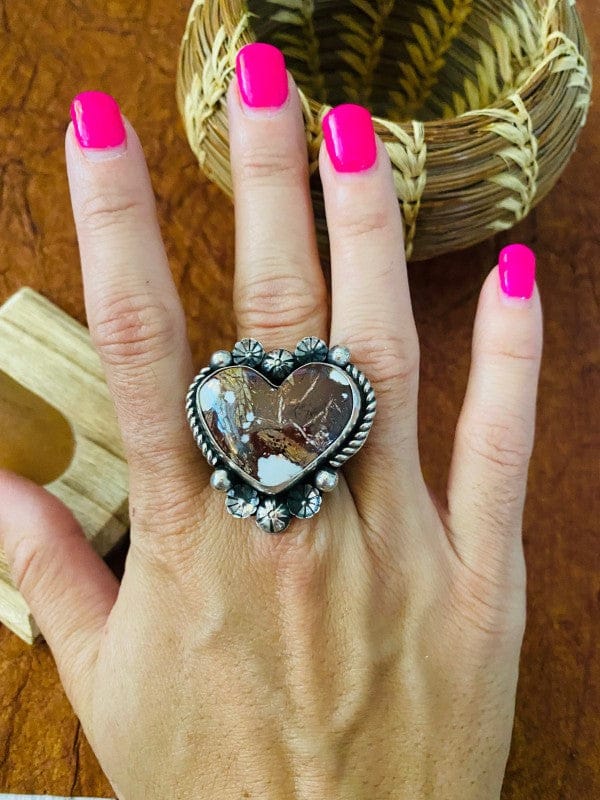 Beautiful Sterling Silver & Wild Horse Heart Ring. Measuring 1 3/8 inches long aneed wide. Beautiful statement ring. Signed by the artist and stamped Sterling.