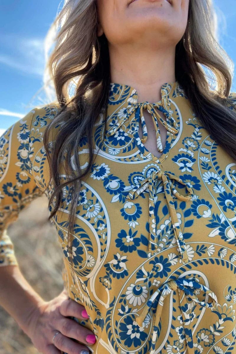 Meet your new favorite top! The High Noon Honey Top serves up Western vibes with a fun twist—think warm mustard tones paired with a gorgeous blue and cream paisley print that's anything but boring. Whether you're dressing it up or keeping it casual, this playful piece brings instant personality to your closet. It's the kind of top that makes you smile every time you wear it.