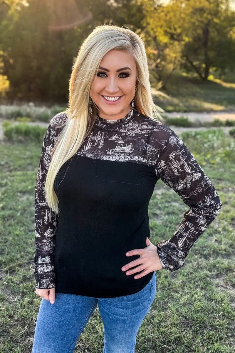 Elevate your wardrobe with the Homestead Toile Top, featuring sleek black fabric complemented by mesh sleeves adorned with a delicate cream toile pattern. This unique combination delivers a sophisticated, modern look while offering breathable comfort. Perfect for dressing up or down, it adds a refined touch to any outfit.