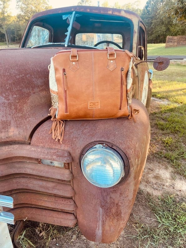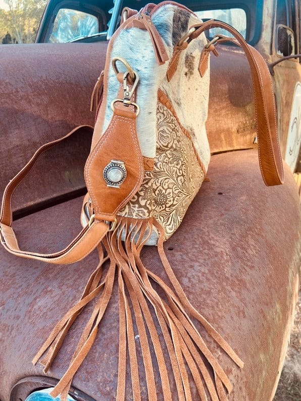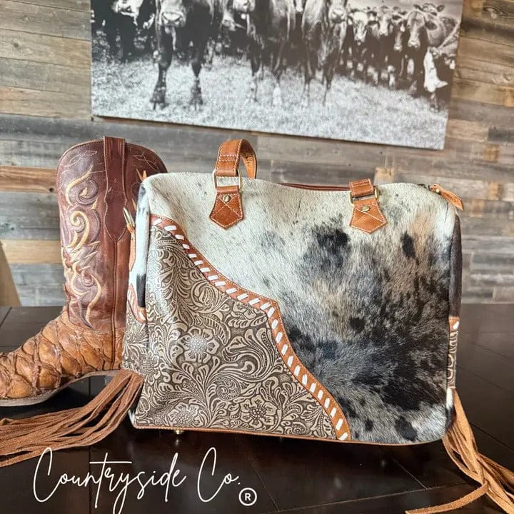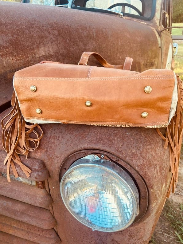 The Laramie Ridge Cowhide Tote blends rugged Western character with timeless craftsmanship. The front showcases beautifully tooled leather paired with genuine cowhide, accented by white leather stitching for striking contrast and detail. Distressed leather trim adds a perfectly worn-in, heritage feel.