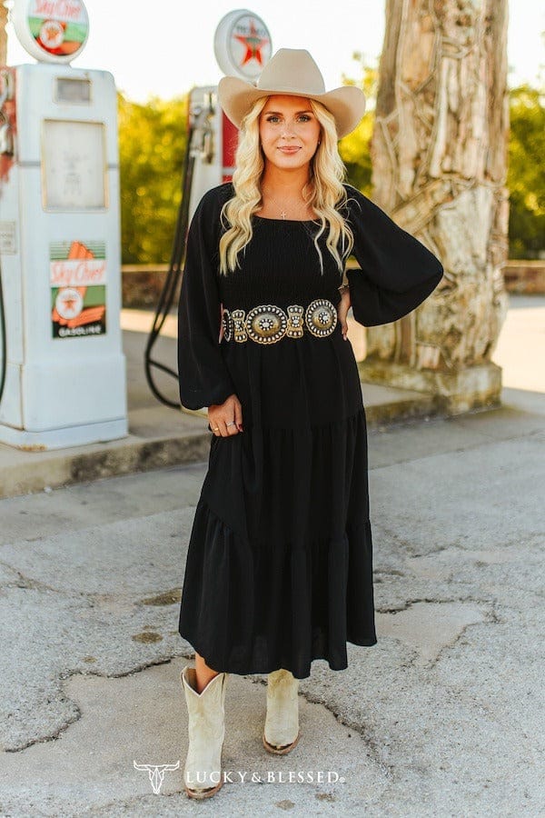 Effortlessly elegant with a Western twist, this black tiered Midnight Prairie Maxi Dress is the perfect blend of comfort, style, and versatility. Designed with a smocked bodice for a flattering, stay-put fit, it features dramatic puff sleeves that add soft volume and a feminine silhouette. The flowy tiered skirt moves beautifully with every step, making it ideal for year-round wear.