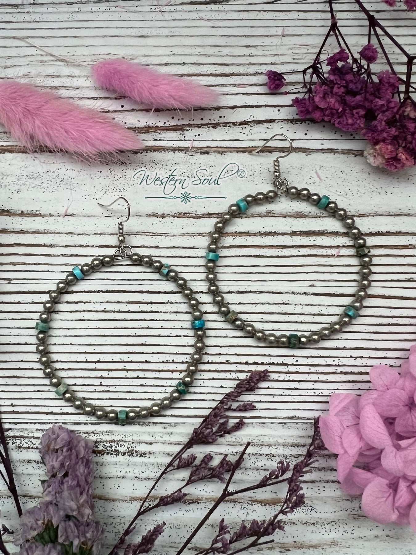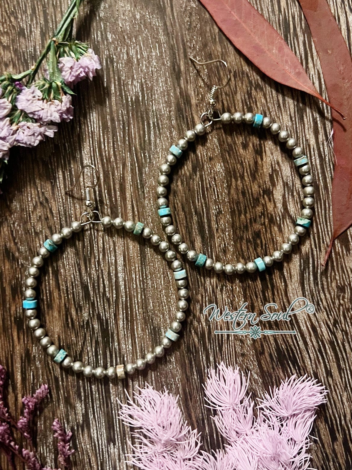 Light, effortless, and inspired by wide open western skies, the Prairie Sky Hoops bring timeless simplicity with a soft Southwestern touch. These 2-inch hoop earrings feature smooth 4mm silver-plated beads accented with composite turquoise tones for a subtle pop of color.