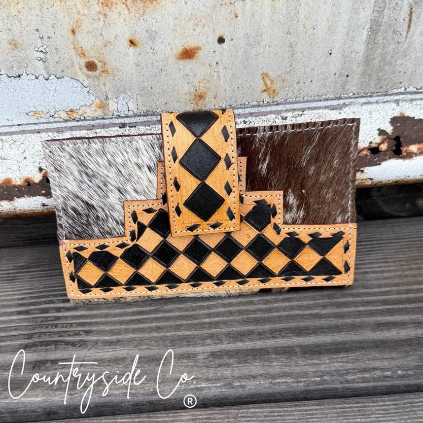 Where rugged meets refined. The Ranchline Checkered Cowhide Checkbook Wallet is crafted with genuine cowhide on both the front and back, accented by a bold checkered leather pattern. A secure snap closure keeps everything in place, while rich leather stitching highlights the craftsmanship in every detail.