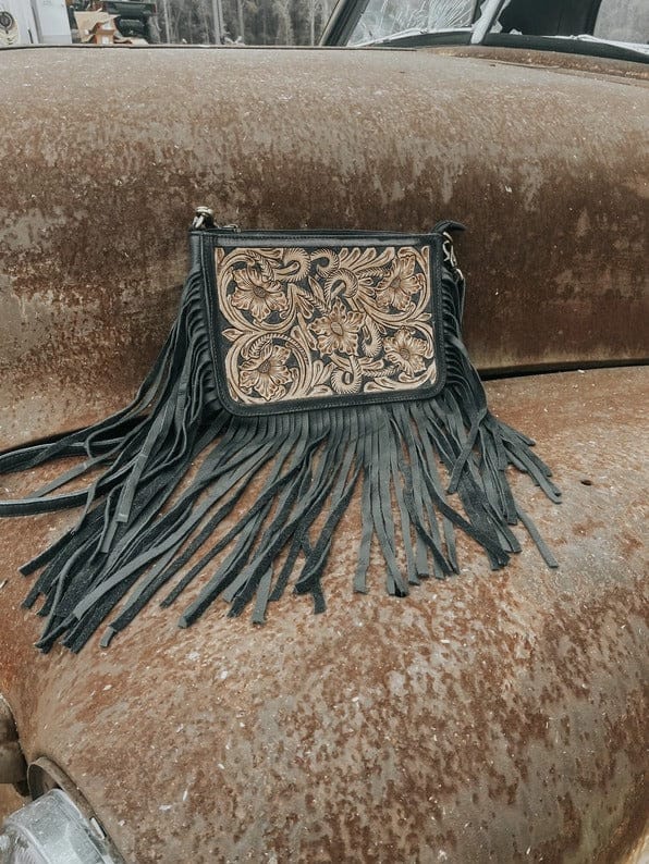The stunning Rio Grande Tooled Leather Crossbody Handbag blends classic Western artistry with modern functionality. Featuring rich hand-tooled detailing, playful fringe edges, and a detachable adjustable strap, it’s designed to move effortlessly from daytime errands to night-out style. The roomy interior and sleek black leather back keep your essentials organized while elevating every outfit.