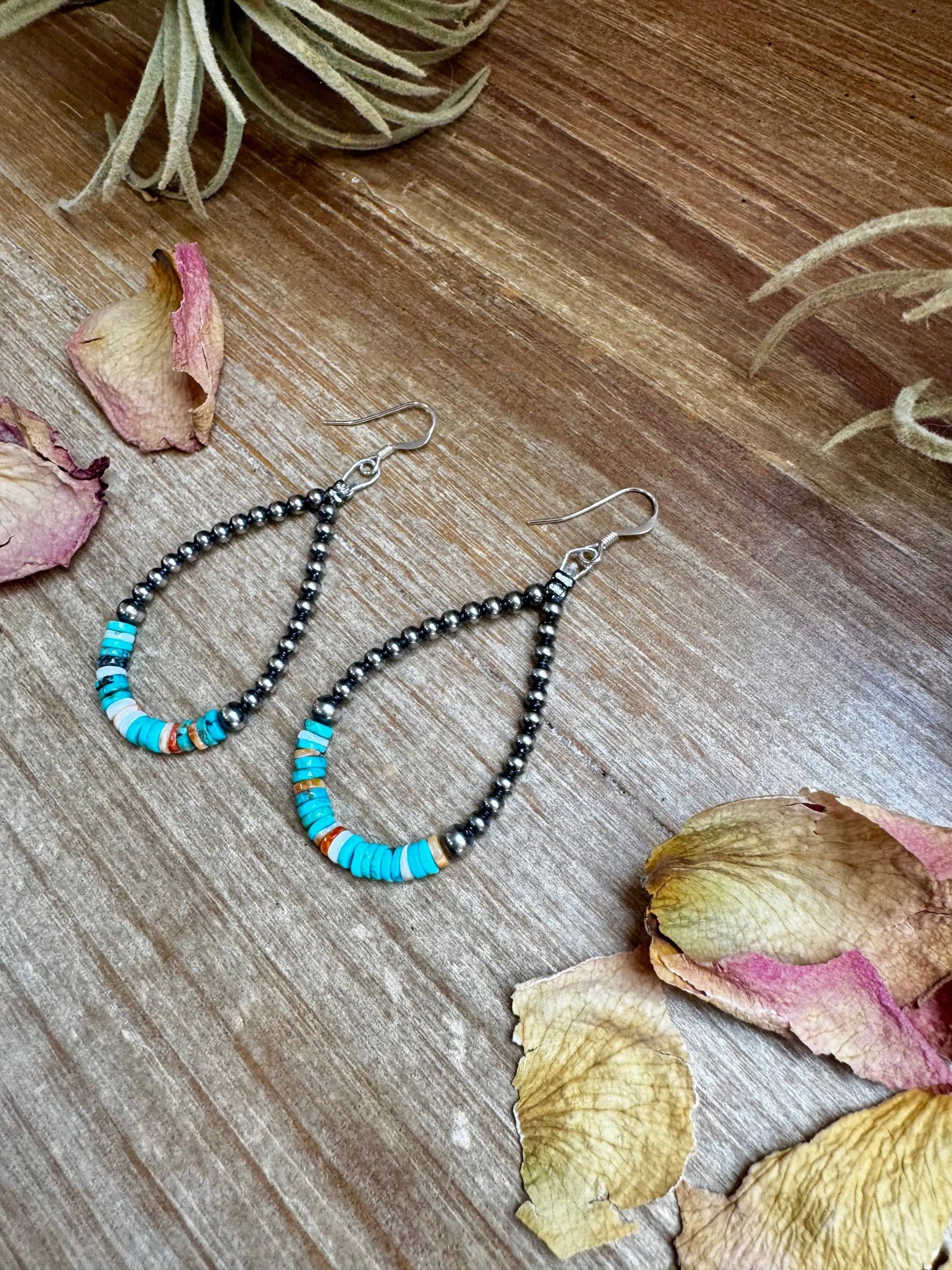 These lightweight drop earrings are handcrafted in Texas and designed to bring effortless color and movement to any look. Featuring 3mm and 4mm sterling silver pearls paired with a vibrant mix of blue turquoise and orange spiny heishi beads, each pair offers a beautiful balance of shine and earthy texture.