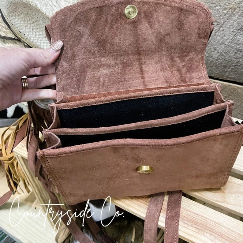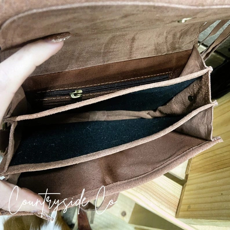 This Suede & Cowhide Fringe Crossbody Bag blends effortless Western charm with everyday functionality. Featuring a genuine cowhide flap with flowing fringe, a soft suede front and back, and classic leather detailing, this bag delivers standout style with a lightweight feel.