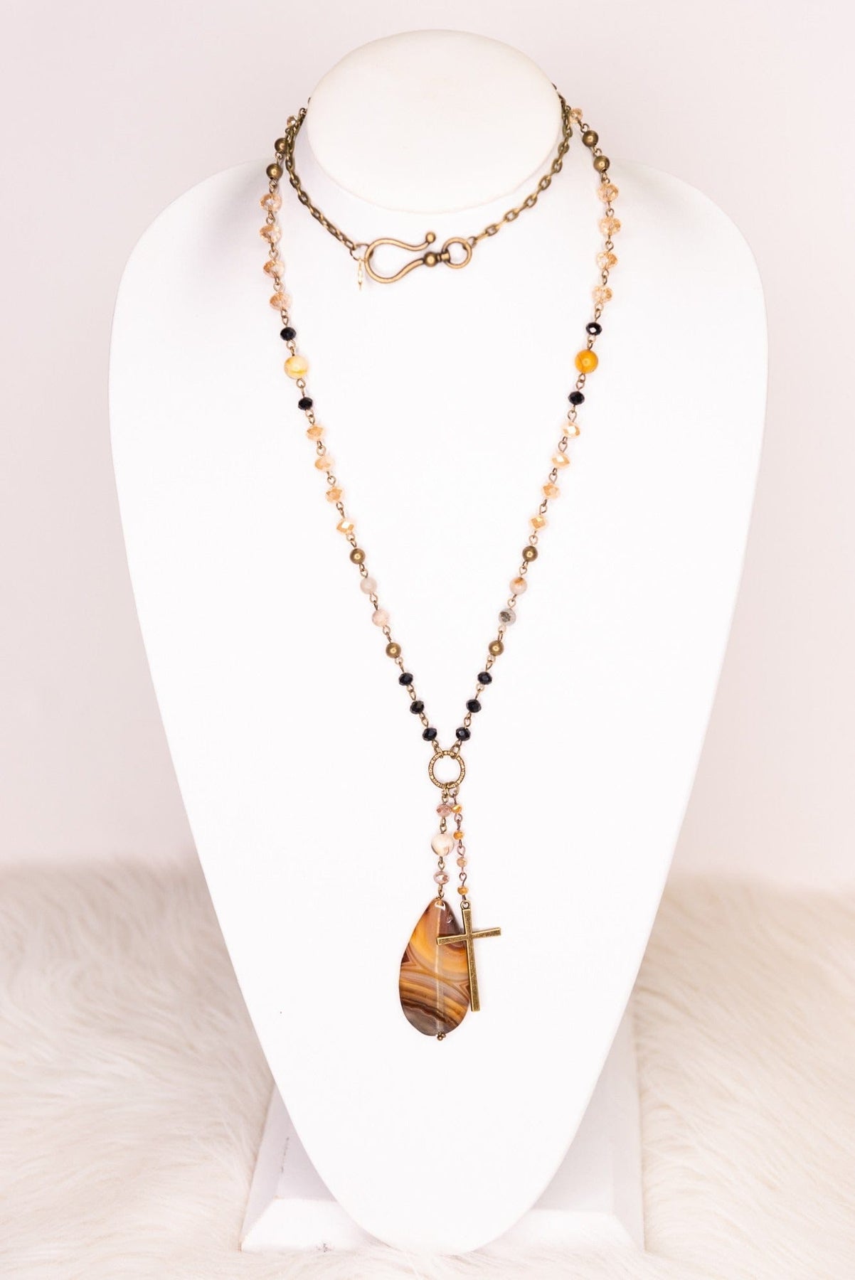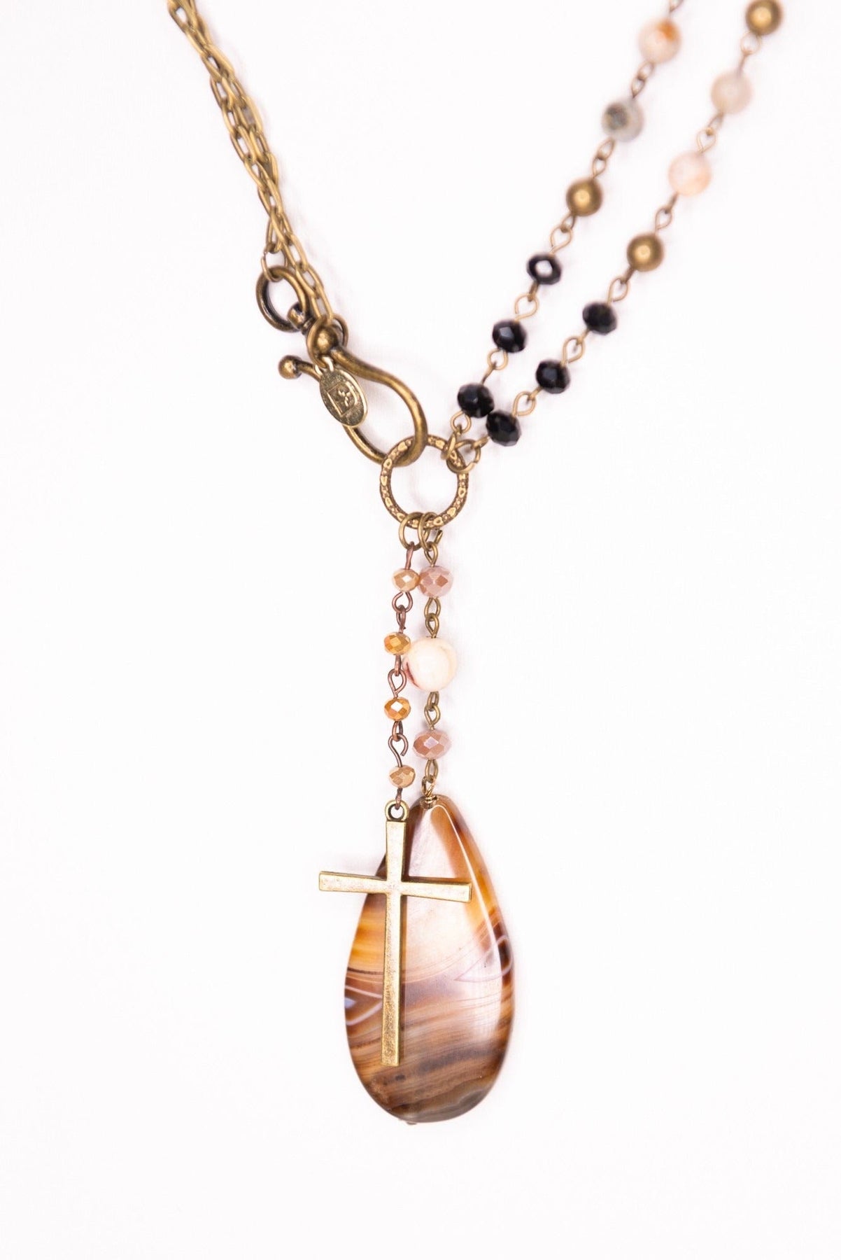 This unique, adjustable necklace features a mix of natural stones and beaded chain links in warm neutral tones. The design includes three distinctive charms — a polished brown tri-color agate teardrop, a bronze cross, and dainty beaded accents — creating the perfect balance of rustic beauty and spiritual symbolism.