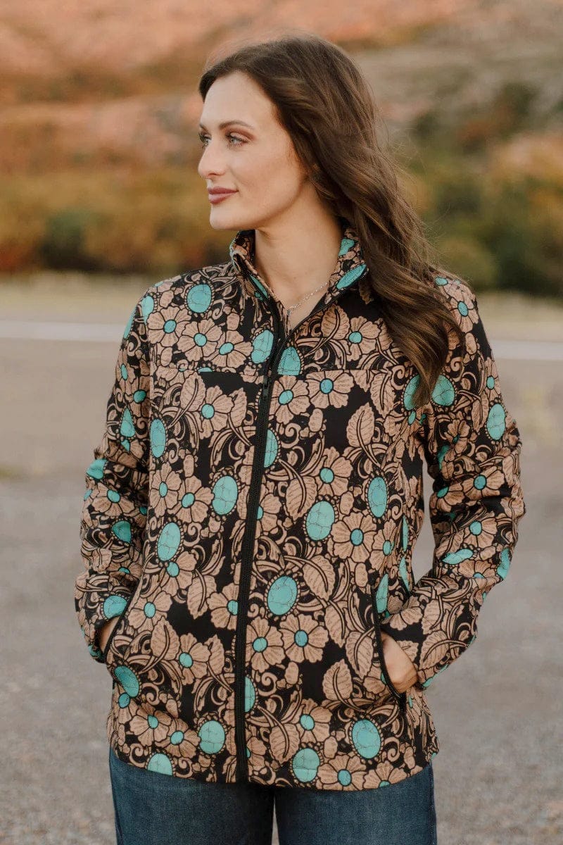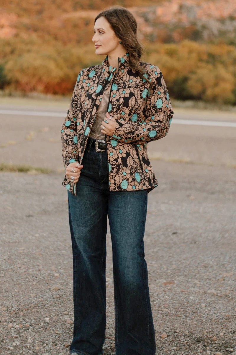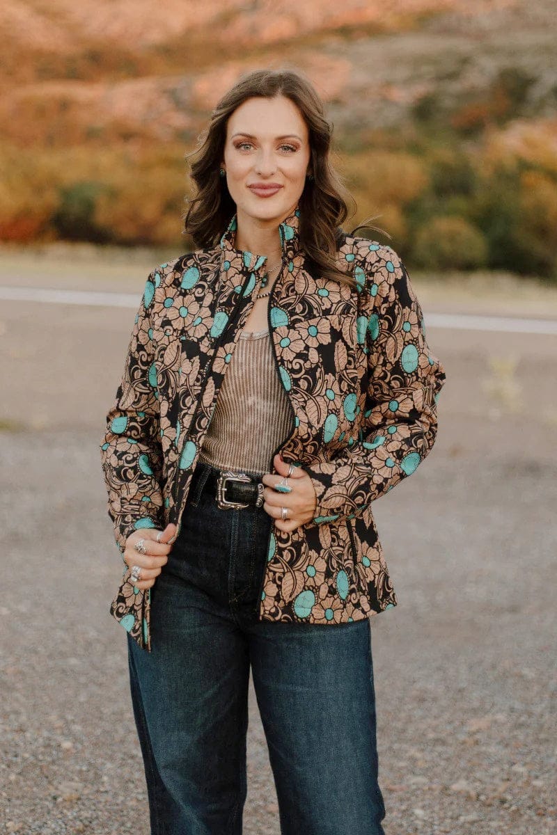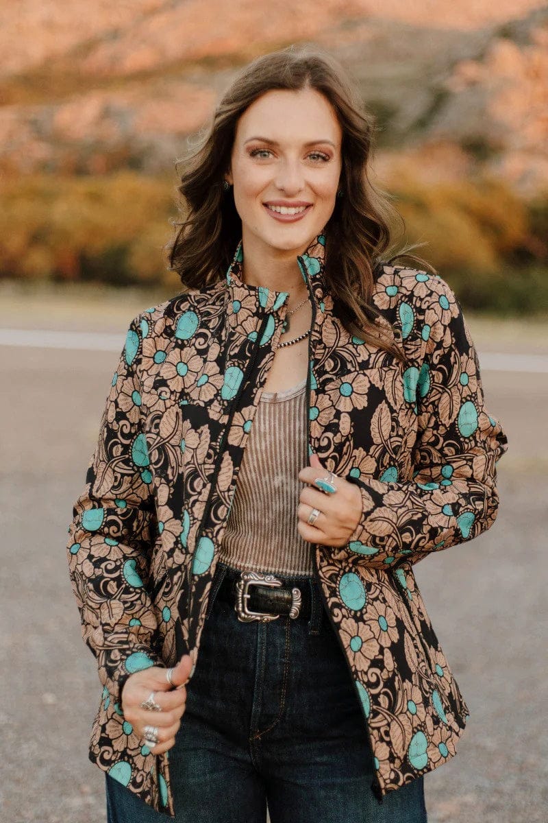 Elevate your outerwear with the Tattoos On This Town Jacket, featuring a unique tattoo-inspired tooled pattern that adds bold character to your look. Accented with vibrant pops of turquoise, this shell jacket blends edgy style with eye-catching color, making it perfect for standing out in any crowd. Durable and distinctive, it’s designed to keep you comfortable while showcasing your fearless fashion sense.