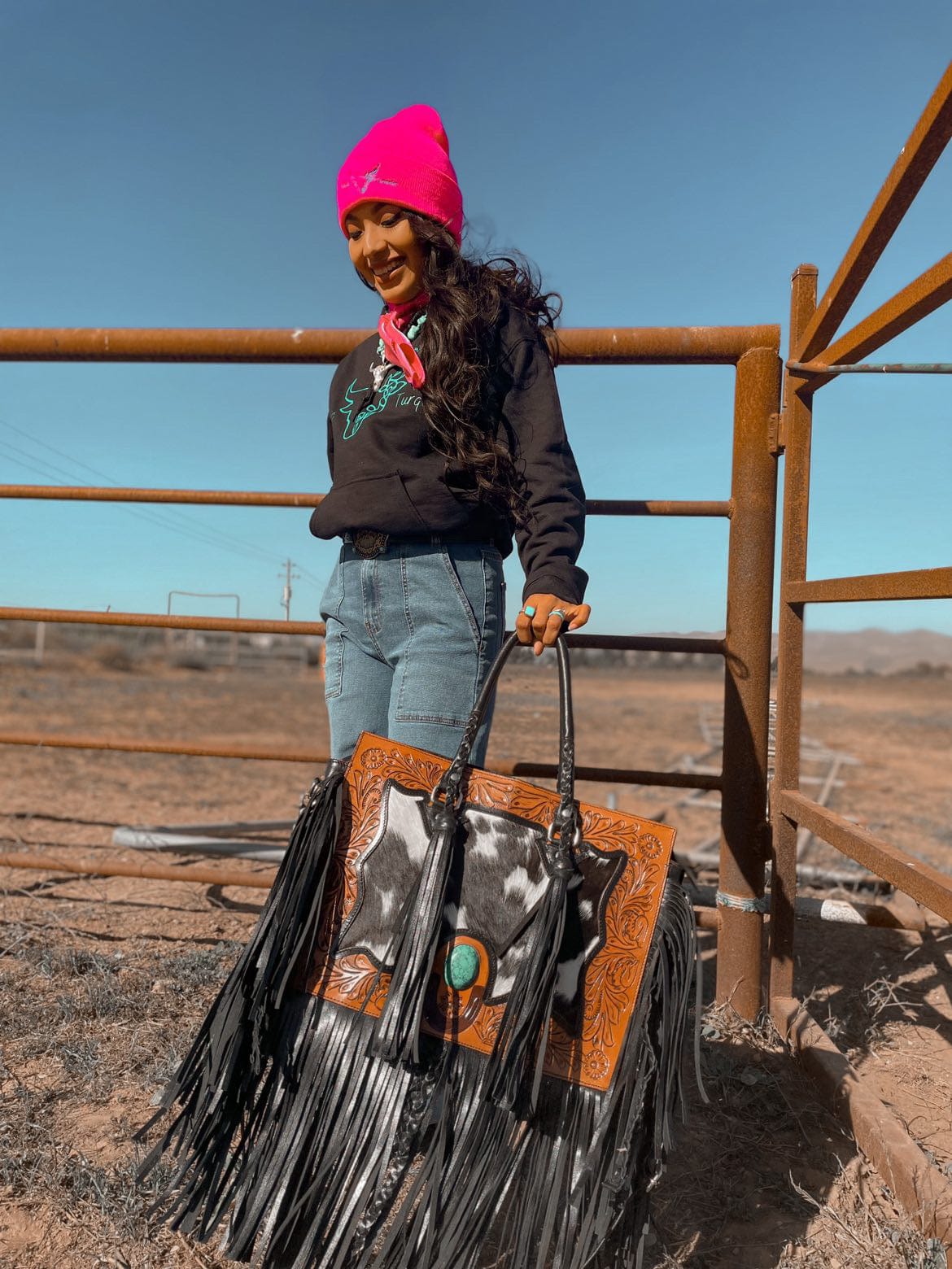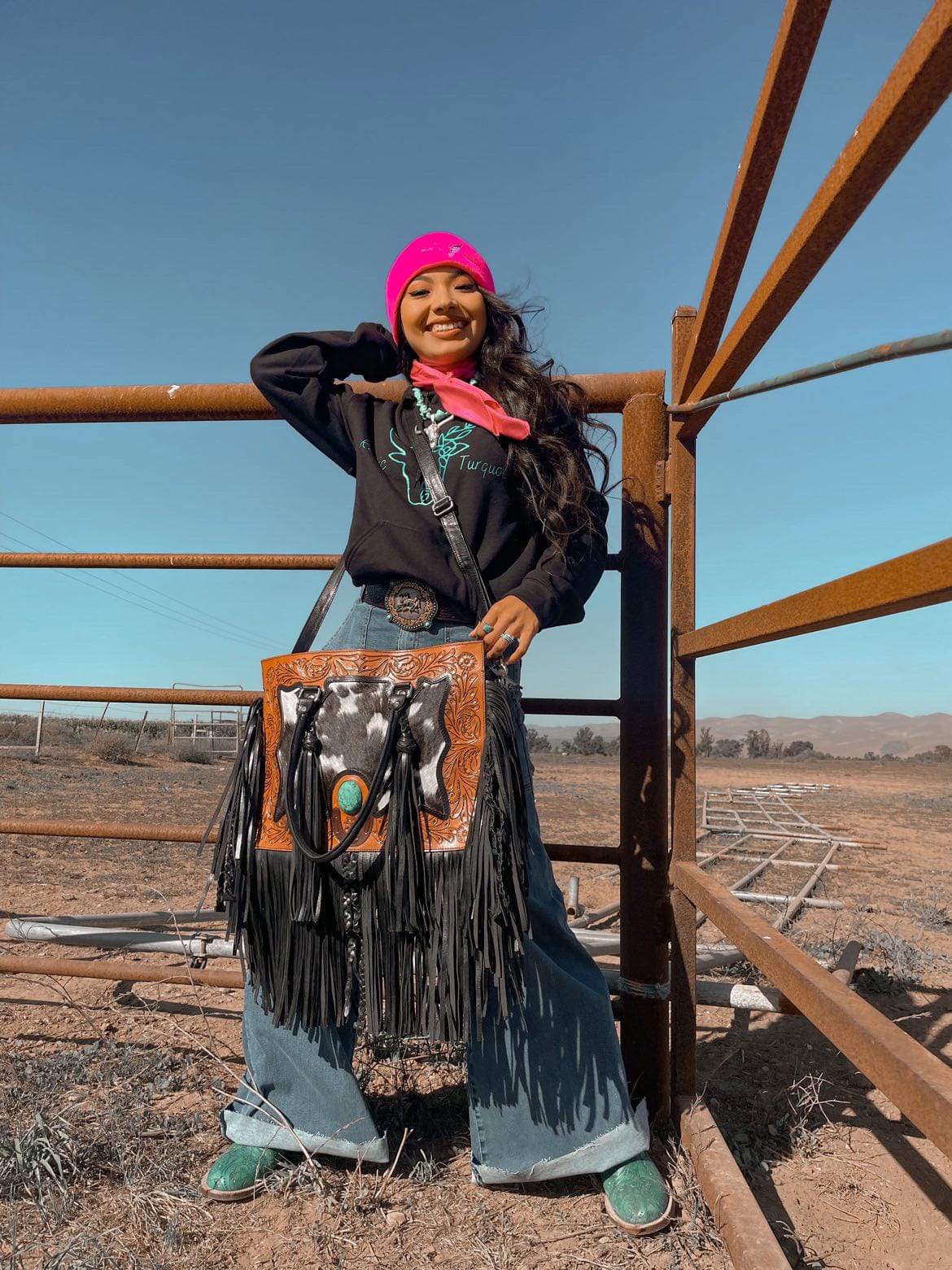 The Nashville Gunner boasts a sexy red velvet interior, a Concealed Carry Pocket in the rear accessible for left/right carry, huge storage capacity, both top handles and a shoulder strap, and a beautiful faux turquoise stone. The interior contains two cubby pockets and one zipper pocket. Please note our latest batch was made without the red velvet and was made with a brown velvet material. The photo does show the layout of interior, however the color will be different for the interior on this batch.  Made with genuine leather and cowhide. The Nashville Gunner is a head turning Gem!