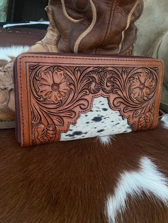 Classic Western craftsmanship meets everyday convenience with the Tooled Leather Cowhide Women’s Wallet Clutch. Featuring beautifully detailed tooled leather paired with genuine cowhide, this clutch delivers timeless style with a bold, one-of-a-kind look. The natural cowhide pattern ensures each piece is truly unique, adding character and individuality to your accessory collection.