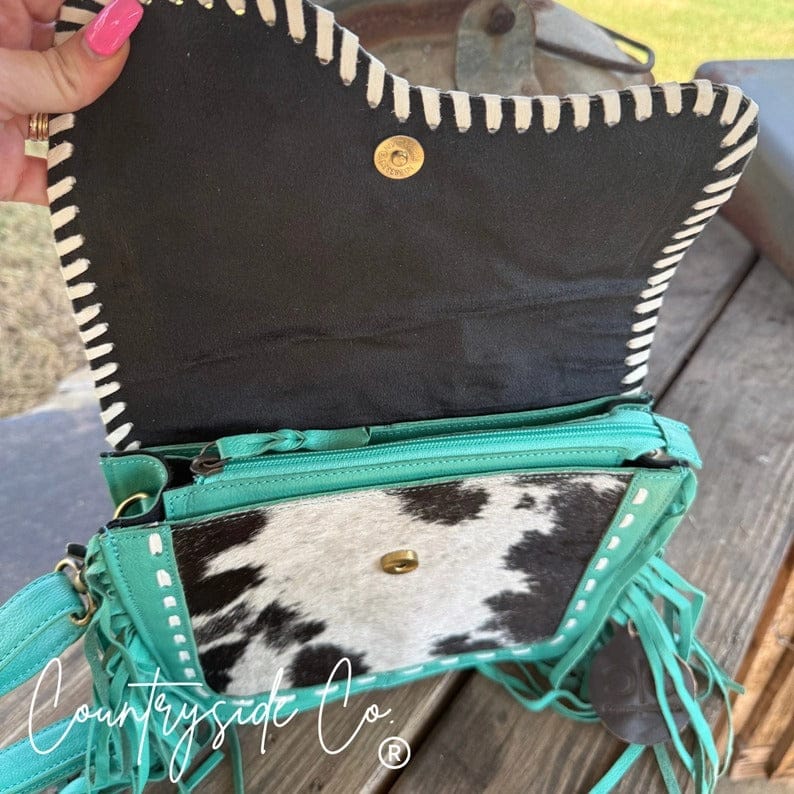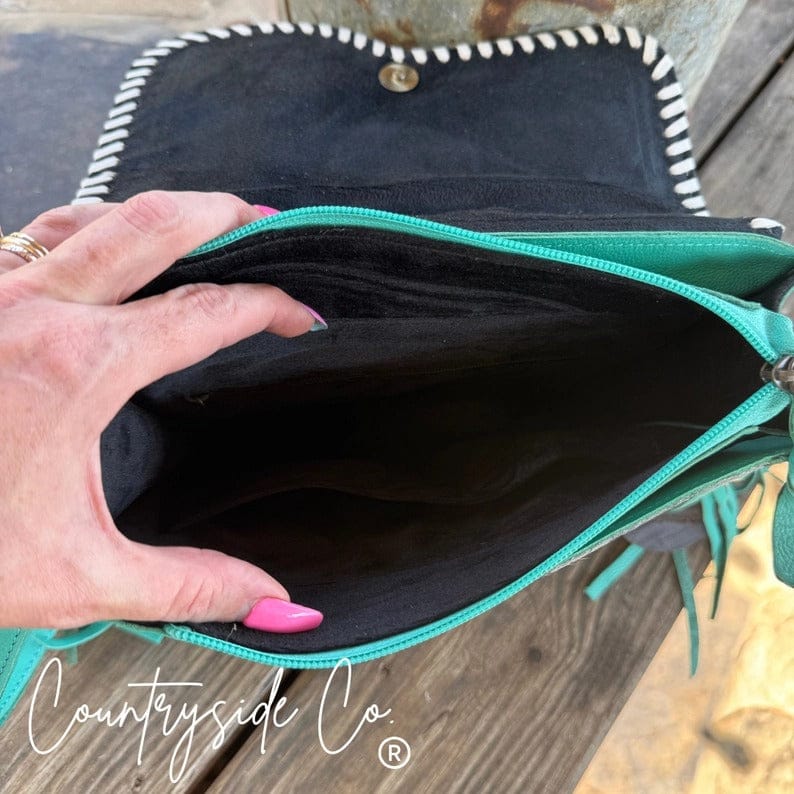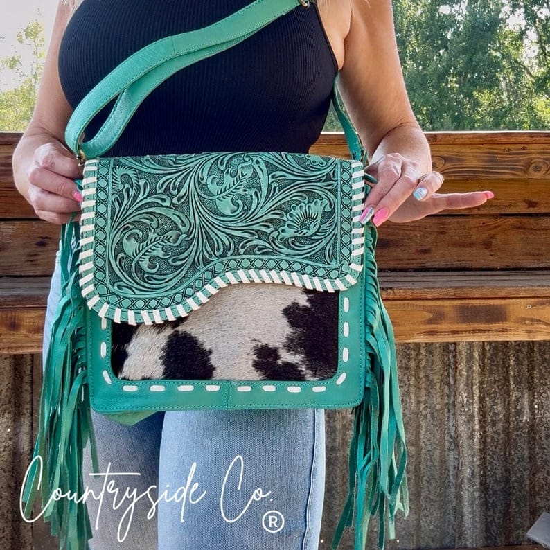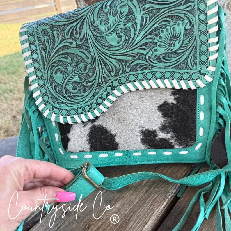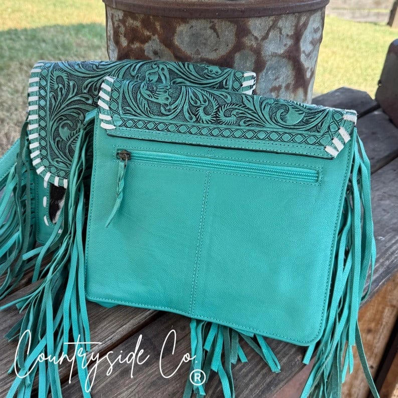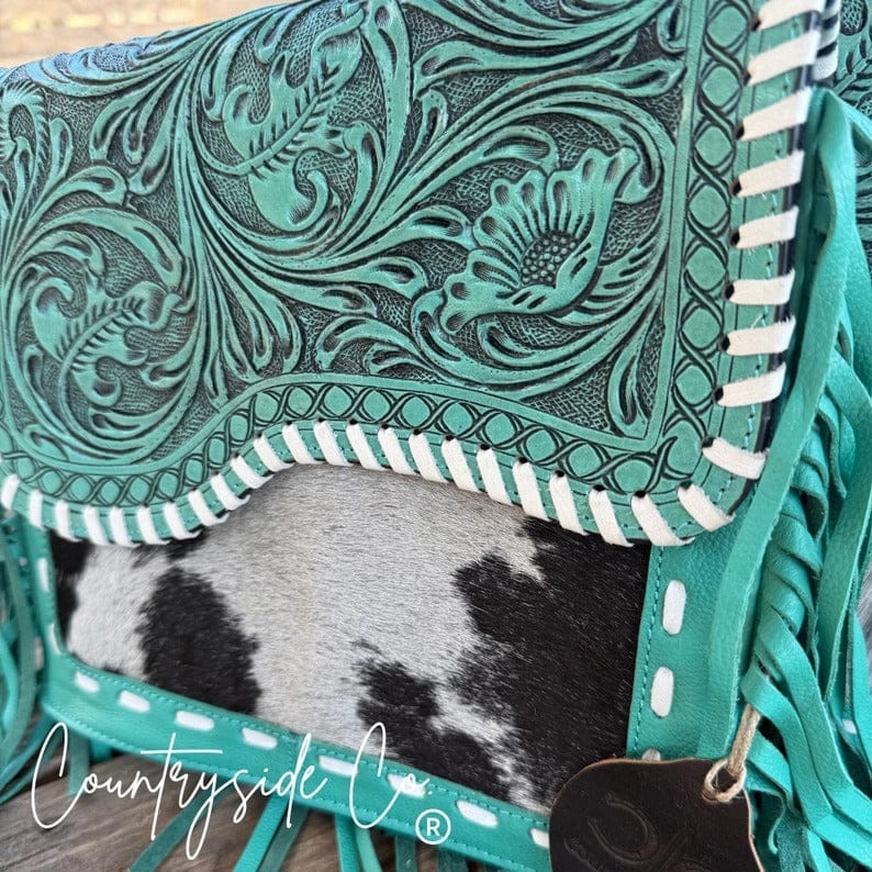 Add a pop of turquoise charm to your Western look with the Turquoise Tooled Leather and Cowhide Bag, a beautifully crafted purse. Featuring a genuine cowhide front and a turquoise-accented tooled leather flap with detailed leather stitching, this design blends rustic elegance with modern style. The smooth leather back provides durability and comfort for everyday wear.