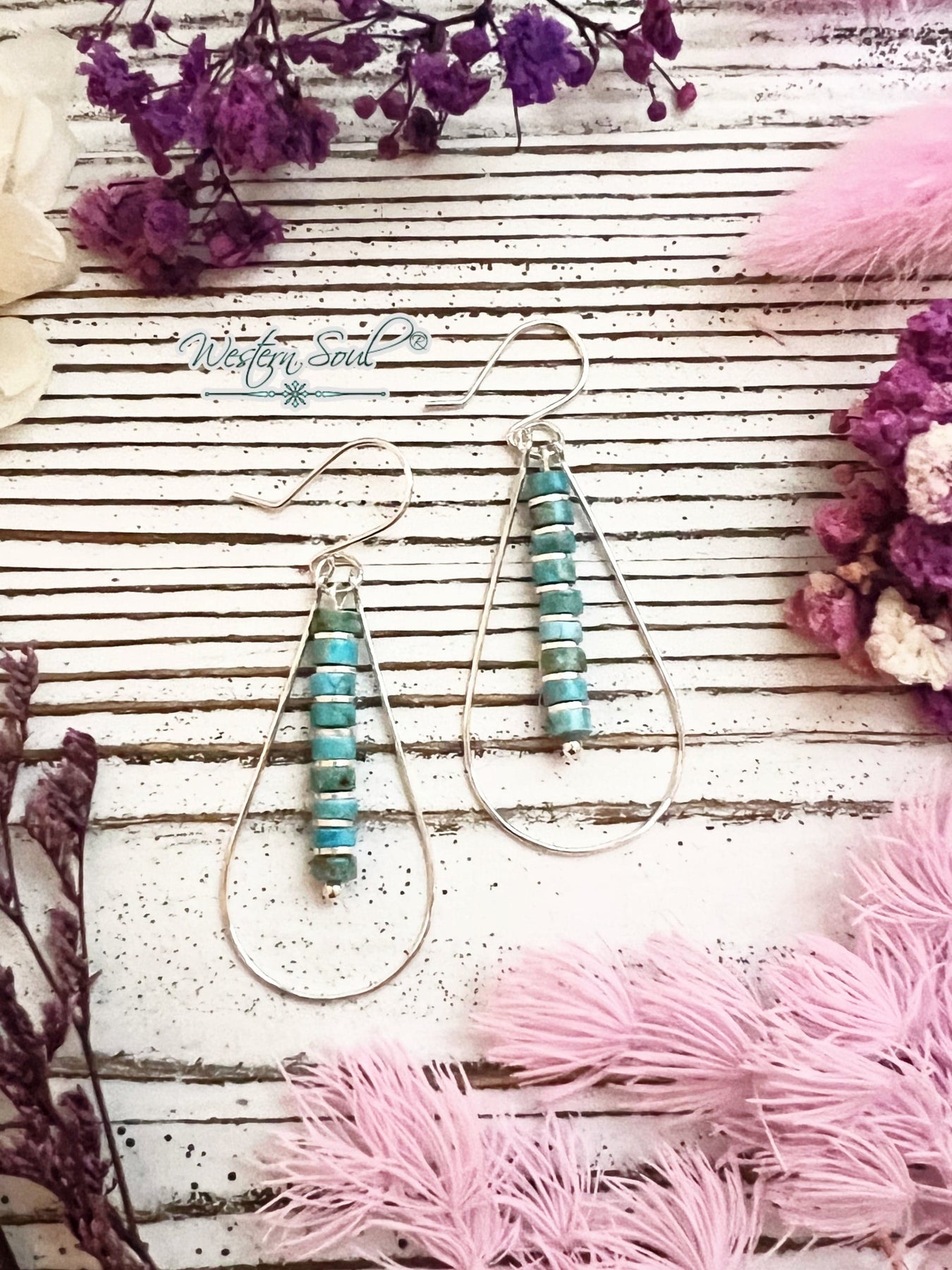 Handcrafted in the USA, these statement teardrops are made with sterling silver and stacked Aqua Terra Jasper beads in rich turquoise tones. The elongated silhouette adds movement and presence, making them the perfect finishing touch to any Western-inspired look.